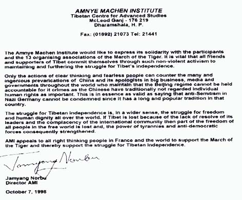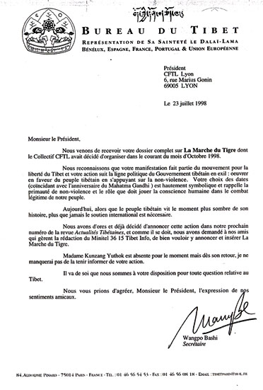 Merci pour votre lettre. Elle etait emouvante. Felicitations pour votre succes au manif. A Quebec, nous aussi avons marche pour 5 jours in 1989 marquant la 35ieme anniversaire de l'occupation. Alors, nous savons l'energie et l'organisation qui faut pour accomplir un tel objectif. Nous vous souhaitons bonne chance. Les membres du Comite Canada Tibet sont tous avec vous en solidarite. Comme Tibetaine, je vous remercie de tout mon coeur...